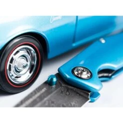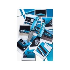 Boker quotes the design of the Camaro Z28 and revives the legend in the extraordinary Boker 1969 Z28-Damascus. In collaboration with the Italian designer Tommaso Rumici, a unique “muscle knife” was created that combines the distinctive character traits of the Camaro Z28 in form and strength. The elegant Damascus drop point blade, hand forged by Chad Nichols with 80 layers in the Tread pattern, reminisces of the sloping cowl induction bonnet of the muscle car. For this purpose, parts of the upper A-arm from the Camaro were used for the blade, that opens smoothly with the blue thumb stud, while the biting stainless steel liner lock reliably locks the knife in place. Based on a colour analysis of an original model, the finely tuned lacquer finish in “Le Mans Blue” was created especially for Boker for the aluminium handle, which interprets the lines of the body in a nostalgic way and comes up with exciting details. The notchback, the small rear spoiler and the gill-like air intakes on the rear wings have been beautifully integrated into the knife. The blade axle screw is lovingly inspired by the rims often used on muscle cars, whereas the straight-lined stainless steel clip, milled from the solid, is reminiscent of the chrome plated door handles. Delivery includes a quality floating display, plenty of torque and a gentle breeze in your hair. Handmade in the Boker Manufactory in Solingen.