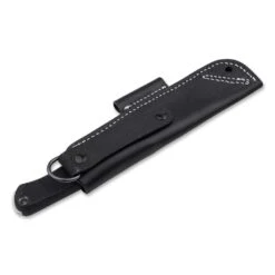The wide drop point blade has an optimal length of 10.3 cm and a medium to high grind for maximum stability. This stability is further ensured by the uncompromising choice of Böhler N690 steel. The tang is continuous and protrudes a few millimetres from the end of the handle. This ensures maximum stability. TPE – thermoplastic elastomer – was chosen as the handle material. The material completely encloses the tang and has a classic checkering for optimal grip. TPE is resistant, elastic, non-slip and has low heat conductivity. The knife therefore lies securely in the hand in all weather and working conditions and does not draw the power out of the fingers in wet and cold conditions. The recessed lanyard hole is additionally set with a stainless steel sleeve. A quiver leather sheath is included – the supreme discipline in sheath construction – with a deep and firm fit for the knife. The knife is thus protected in the best possible way against both loss and damage when carried, without requiring a damage-prone lock that makes quick access difficult. A removable dangler allows either a high carrying position on the belt or a low position under the hip belt of the touring backpack. In addition, the sheath is equipped with a wide leather loop, firmly integrated into the welting, which provides space to accommodate a fire starter (9.3mm) (not included).