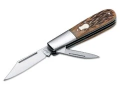 The classic American Barlow pocket knife is distinguished by its characteristic, overlong bolsters and the sizable dimensions of its handle. Whereas the wide primary blade is used for rougher cutting chores, the small accessory blade is particularly useful for detailed and delicate cutting chores. Jigged bone is the classic grip material that also harmonises with the stainless steel bolsters and liners.